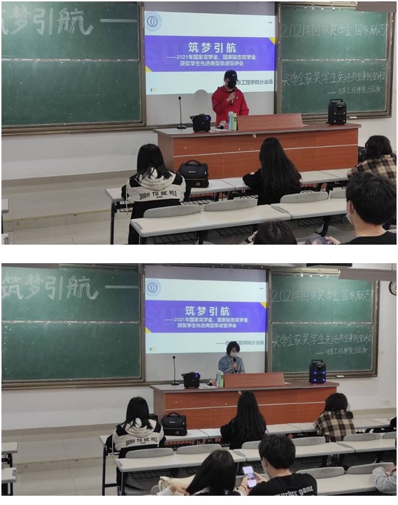 在同学们热烈的掌声欢迎下,分享会拉开了序幕。江邵平同学向我们分享了他“知耻而后勇”的学习经历。大一上学期的他在期末考试中成绩不理想,他再三反思得出教训,最终凭借自律与努力终于拿到了国家奖学金。张子怡同学是退伍军人,在部队的时候就非常刻苦努力,回归老员工活后,最终通过自己的努力学习,获得了国家奖学金,如今的她依旧在努力的路上。