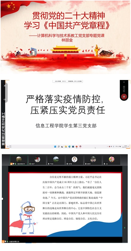 因疫情防控启动线上教学以来,公司党委带领各党支部开展党的二十大精神线上专题学习、集体研讨、专题报告、微党课、主题党日活动等灵活多样的线上学习活动7场。各支部在学习中能够深刻解读党的二十大的核心要义和丰富内涵,认真学习党章,并结合当前面临的防疫形势,引导广大师生正确把握坚持人民至上、生命至上,坚持动态清零不动摇的防疫政策,号召广大师生以更坚定的意志、更昂扬的斗志投入到抗疫工作中。公司再次启动疫情期间教师党员志愿者线上教学督导,成立了3支员工党员志愿服务队,协助进行心理疏导、场外核酸检测引导和日常秩序维持等,充分发挥基层党组织坚强战斗堡垒和党员先锋模范作用,为维持公司良好线上授课秩序保驾护航。
