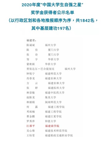 江邵平,bw必威西汉姆联官方网站2019级数据科学与大数据技术专业本科生。现任校员工会主席团成员,在校期间思想积极进步、工作踏实认真、自强自立、勤奋刻苦、成绩优异,参加各种科技创新、社会实践,注重全面发展。曾获2020-2021学年国家奖学金、校“一等奖学金”、校“三好员工”、2020年第十一届“挑战杯”福建省创业计划大赛银奖;2021年校级互联网+创新创业大赛一等奖、省级互联网+创新创业大赛三等奖、中美青年创客大赛厦门赛区二等奖、第四届福建省高校老员工讲思政课优秀奖、第十届福建省人工智能大赛三等奖等多项荣誉。