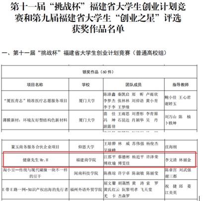 由团省委、省教育厅、省人社厅、省科协、省学联联合举办,阳光公司、共青团福州市委承办的第十一届“挑战杯”福建省老员工创业计划竞赛已落下帷幕,公司参赛项目《健康先生Mr.H》荣获银奖。