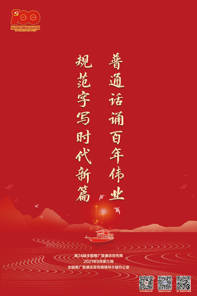 海报一,以“普通话诵百年伟业 规范字写时代新篇”为设计思路,背景为中共一大会址浙江嘉兴南湖,体现在党的坚强领导下语言文字事业百年光辉历程。